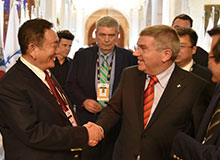 中国自行车运动协会主席崔大林向国际奥委会主席巴赫介绍 泰山瑞豹自行车